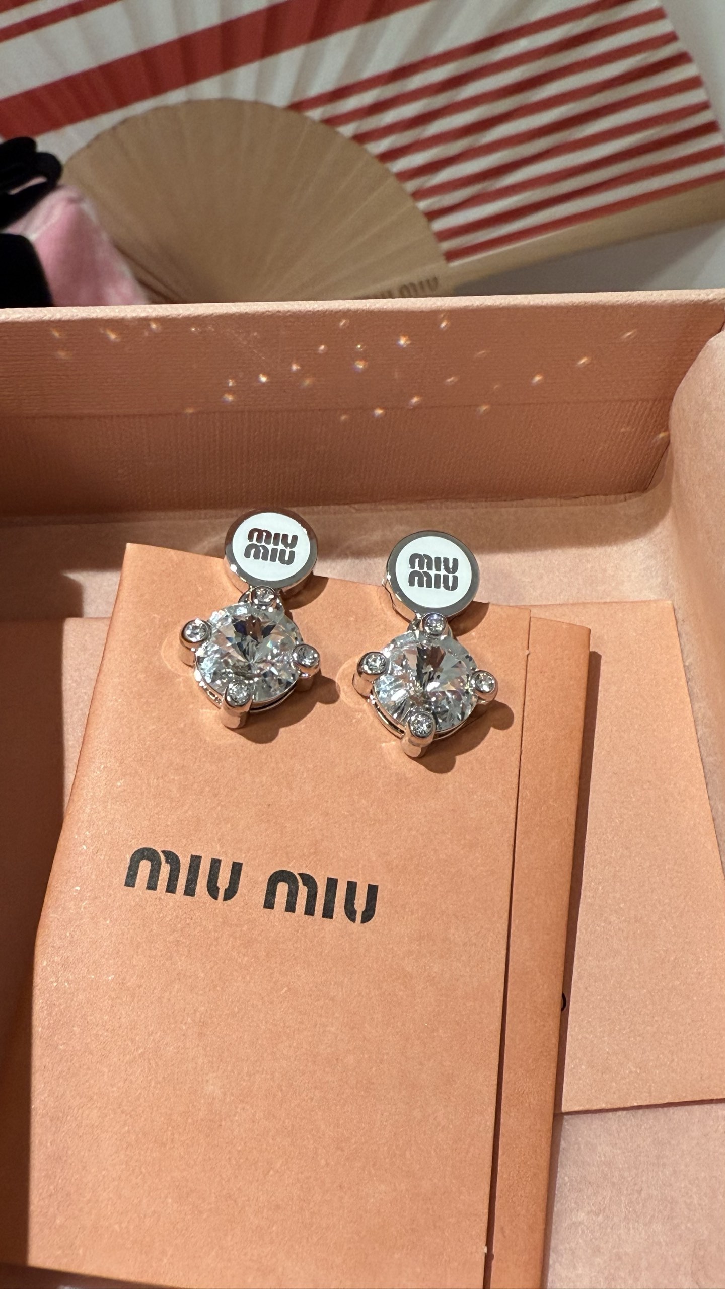 Miumiu 白色圆形珐琅银色字母水晶钻耳环