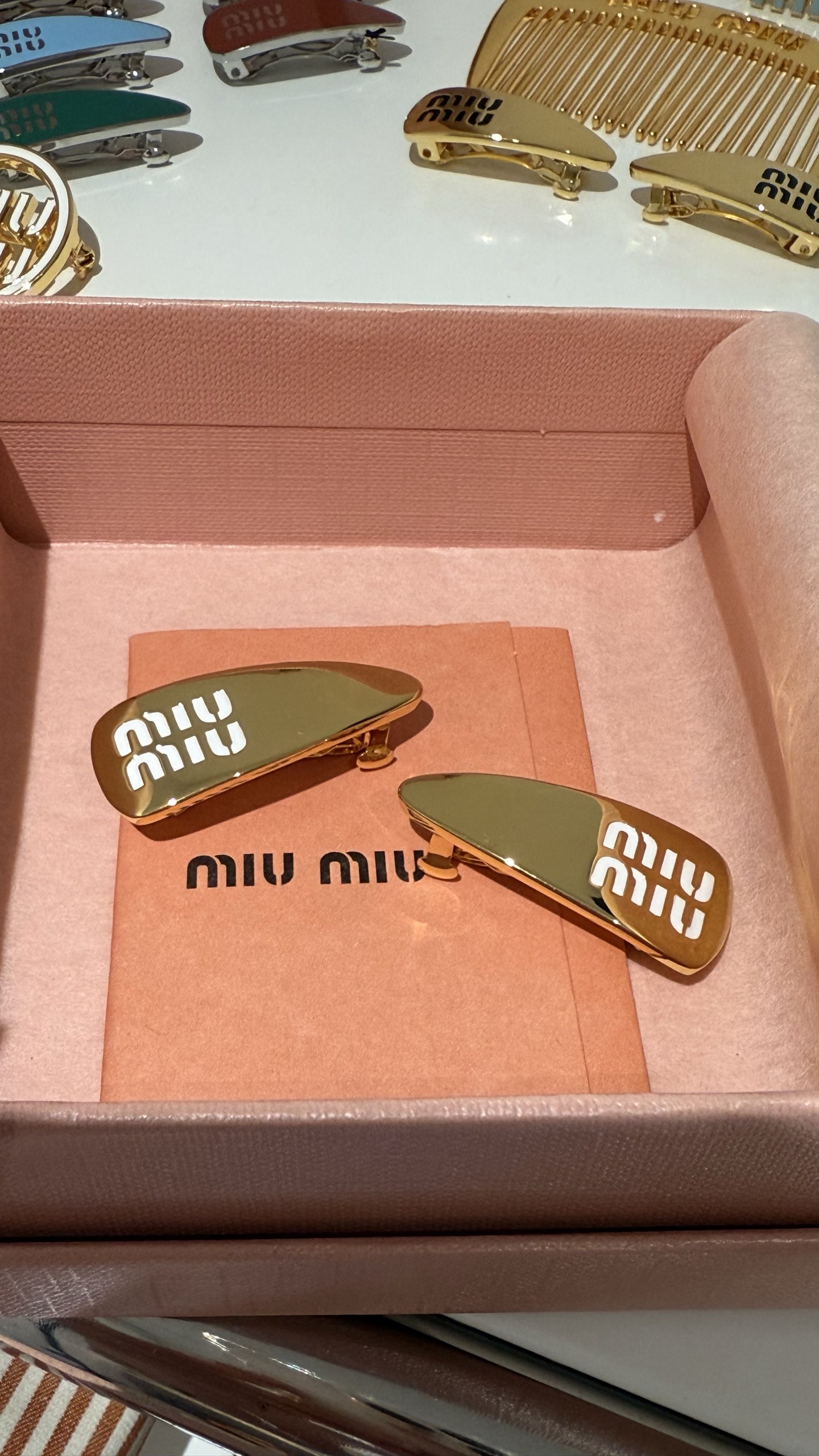 Miumiu 一套两只金色金属白珐琅字母水滴发夹碎发夹迷你小横夹 实拍图✨